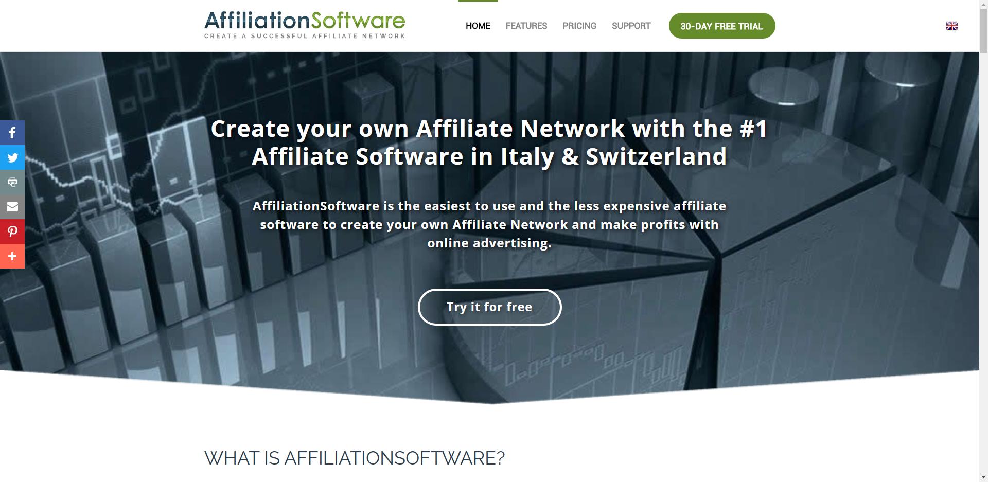 AffiliationSoftware is the No. 1 software in Italy and Switzerland. Il allows you to create your own professional Affiliate Program! An Affiliate Program is a powerful marketing tool used to increase your website's traffic and sales. Affiliates will promote your products on their websites or social network using banners and links, bringing you quality traffic and sales! All the results are tracked automatically and in real time, even after months.