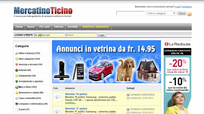MercatinoTicino.com is one of the best online classifieds sites in Ticino today! Are you looking for a home, a car or a job? There are thousands of new classifieds every day! Do you want to sell something? Sign up now and publish your classifieds for free!
